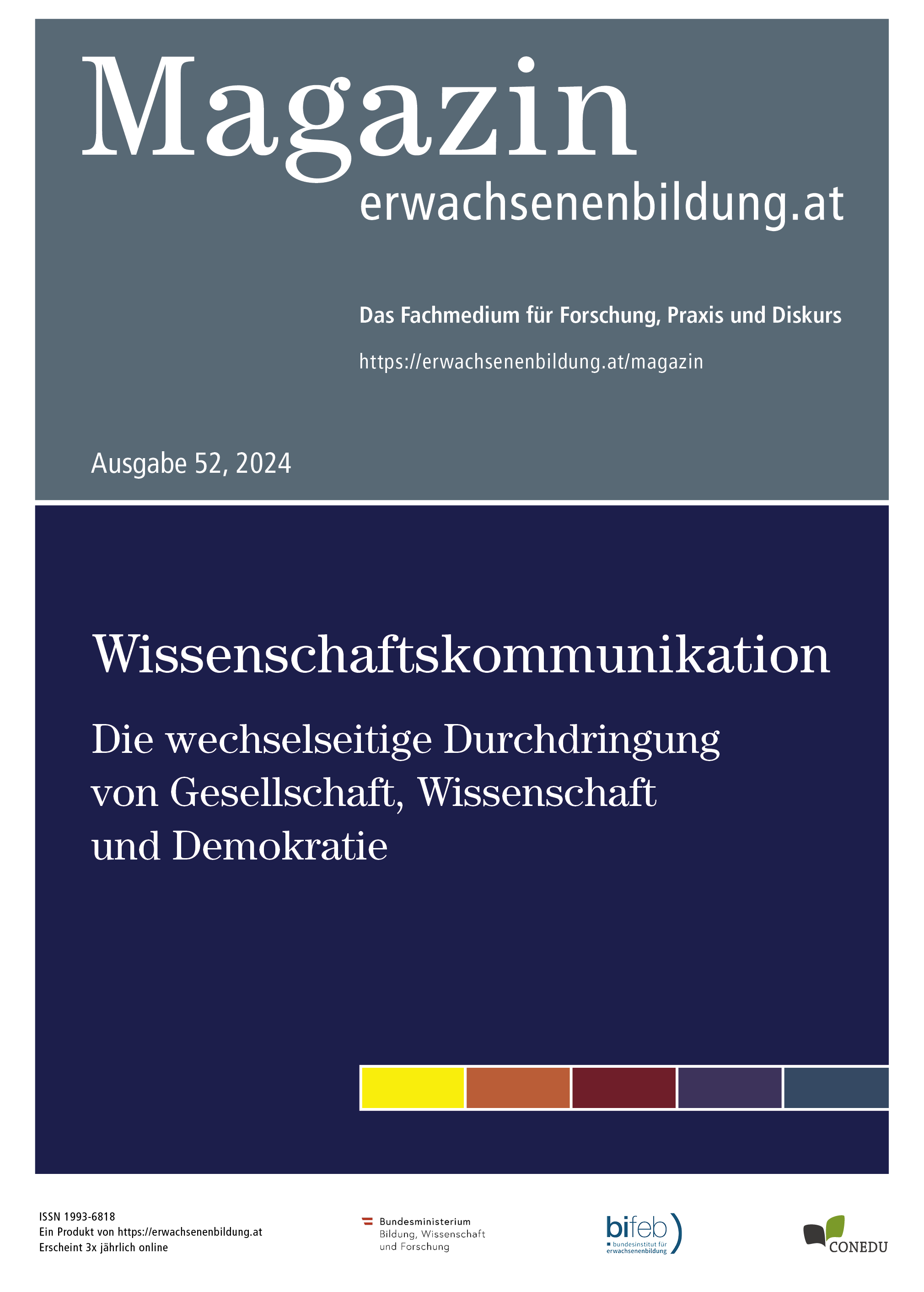Die 52. Ausgabe des Magazin erwachsenenbildung.at mit dem Titel „Wissenschaftskommunikation. Die wechselseitige Durchdringung von Gesellschaft, Wissenschaft und Demokratie“ gibt es kostenfrei online. Herausgeber sind Wissenschaftsredakteur Lukas Wieselberg (ORF Science) und Bildungswissenschaftler Stefan Vater (Verband Österreichischer Volkshochschulen).